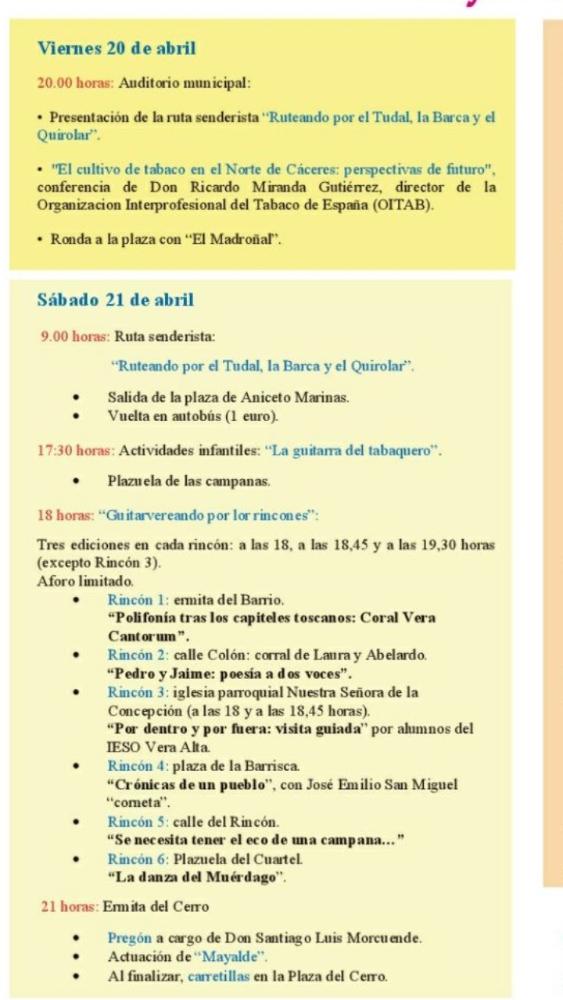 Las actividades se desarrollan a lo largo de un fin de semana, que suele ser el segundo después de semana santa, ante la necesidad de sincronizarse con el calendario lunar que marca las festividades de la primavera. Se comienza por una conferencia relacionada con el tema en cuestión del año y en la que además se presenta el video del año anterior y la mta senderista del día siguiente. Es el primer momento de encuentro principalmente entre la gente del pueblo que vive fuera y la que no, por lo que se finaliza la actividad ya con una ronda desde el auditorio a la plaza, a donde ya han ido acudiendo guitarreros, danzantes y demás asiduos a la fiesta que vienen a pasar los tres días.