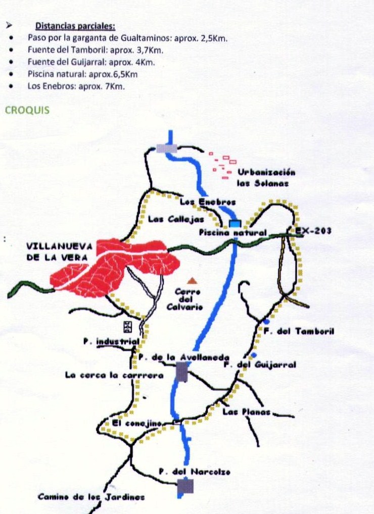 La ruta se inicia desde Villanueva, salimos del pueblo en dirección a Madrigal de la Vera por la EX-203, andamos por la margen derecha de la carretera con anchura suficiente para que no haya peligro con los vehículos.