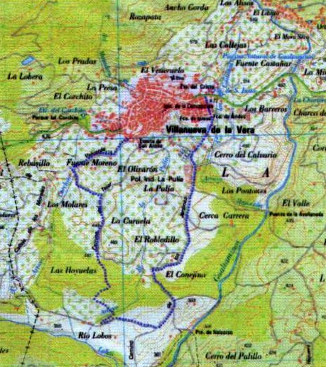 El sendero va paralelo al curso de la garganta, pasando cerca de un molino en ruinas y saliendo a una colada que habrá que tomar a la izquierda. Bajando entre muros de piedra por la colada de Las Callejas, a tramos empedradas, llegamos a Villanueva por la C/ El Prado.